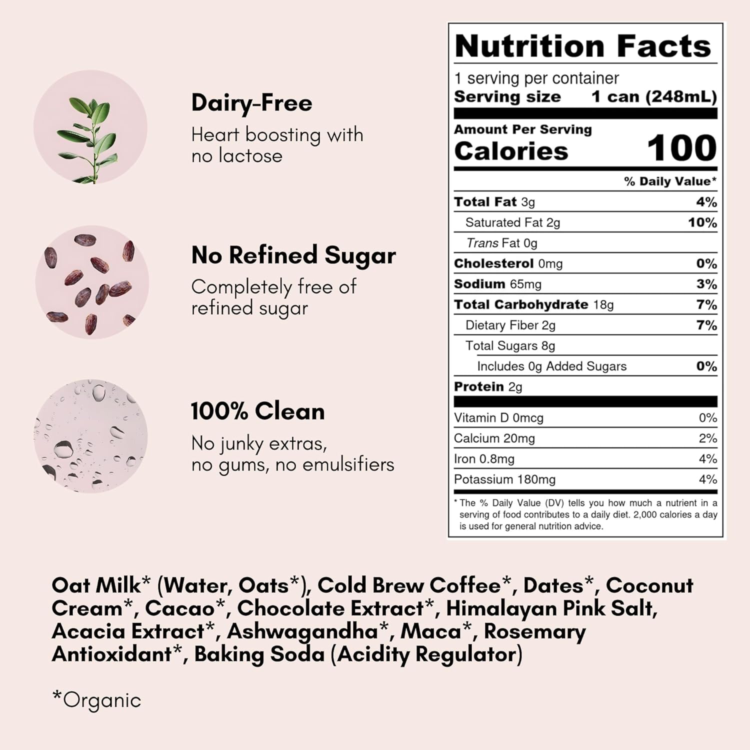 - NO REFINED SUGAR - Each 8oz can has 100 calories, 80mg caffeine, and is sweetened only with organic dates. Enjoy cold from the can, over ice, or warm it up on a cold day for a hot latte
