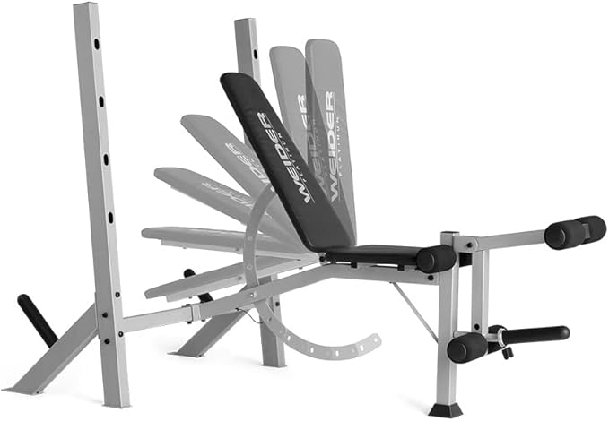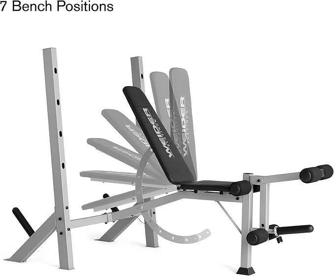 - 7 Bench Positions; Choose between multiple levels of incline, flat, or decline to execute a variety of strength-building exercises; Adjustable Spotting Arms enhance lifting safety