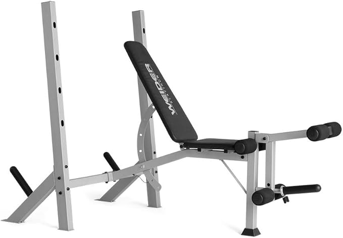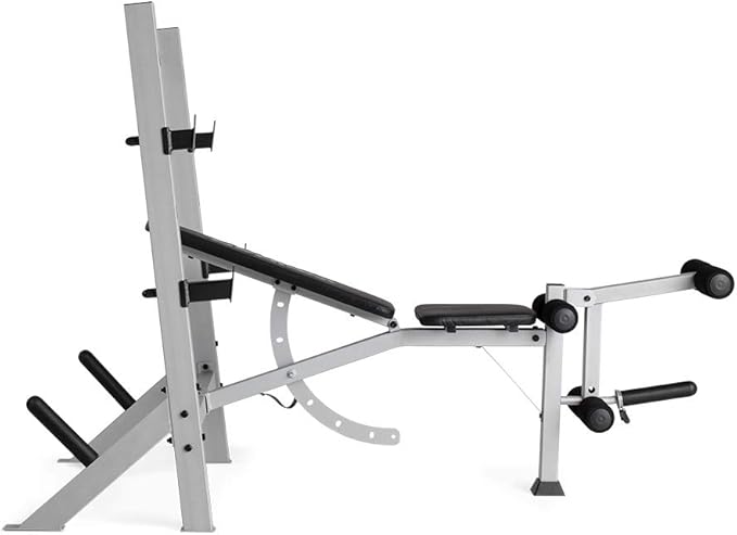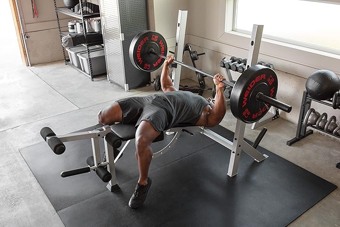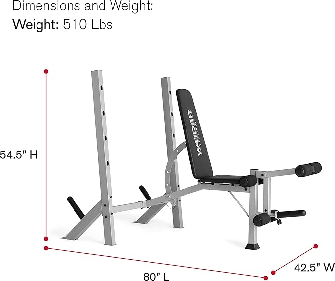 - Olympic Sizing; This weight bench is compatible with 7-foot Olympic barbells and 2” standard weight plates (sold separately); Exercise Chart Included; Learn new routines and proper lifting form
