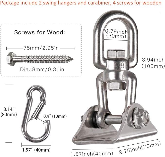 - EASY INSTALLATION: 304 Stainless Steel bracket easily attaches to a wall, vertical stud or secure overhead beam, include 4 Hexagon Wood Screws. There are two holes in the base of the swing hanger, and use screws through this hole to fix it on the wooden beam(If you need to use it on concrete ceiling, please buy expansion bolts separately). snap hook included, So it can be easily connected to items such as the hammock, swing chair or sandbag chain, rope that you need to hang.