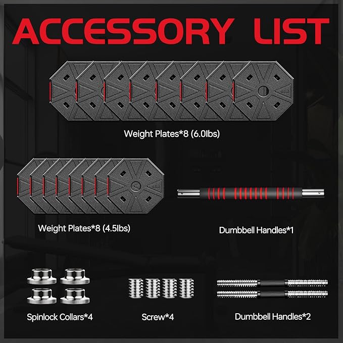 - ✅【WHAT YOU GET】: NOTE: If there is a problem with the nut you received, please contact us in time and we will send you a new nut.✅ Package includes 1x Connecting Rod, 8x2.75KG Dumbbell plates, 8x2.0KG Dumbbell plates. Our dumbbell set comes with a 6-Month coverage for product issue, If you have any questions about the products you, don't hesitate to reach out to our customer service team.