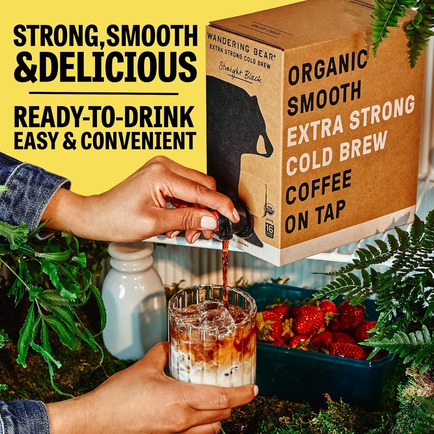 Wandering Bear Straight Black Organic Cold Brew Coffee On Tap, 128 fl oz (1 gallon) - Extra Strong, Bold, Smooth, Unsweetened, Shelf-Stable, Ready to Drink, 100% Organic Iced Cold Brewed Coffee Drinks