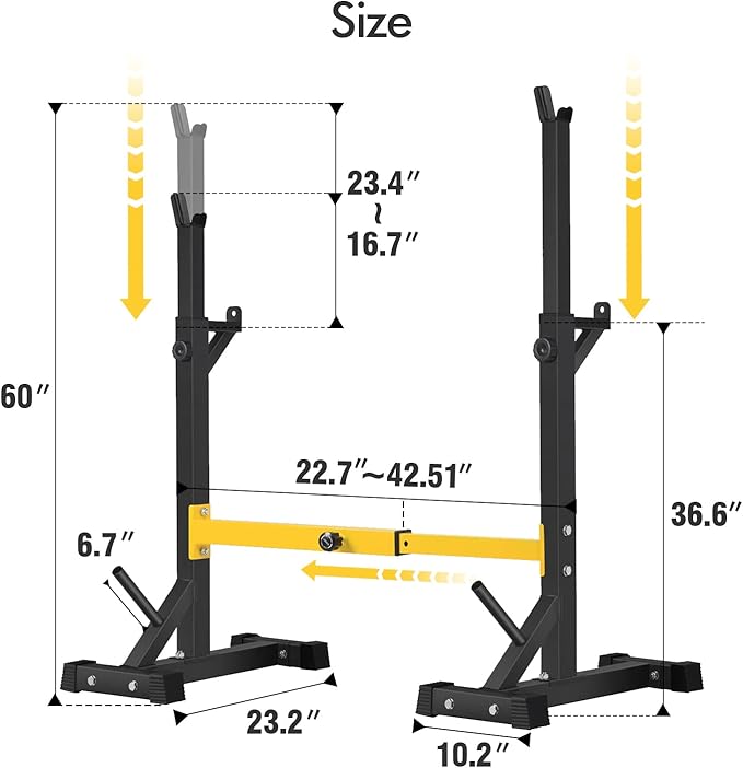 - 😊【Height Adjustable】: Adjustable Barbell Rack that suitable for a variety of height requirement. Bracket Height range of 50”-57'', Adjust the spotters to fit your height need.