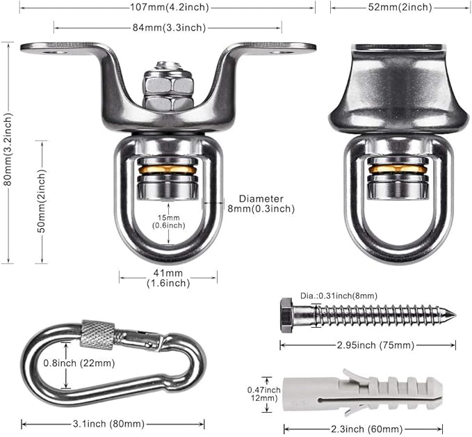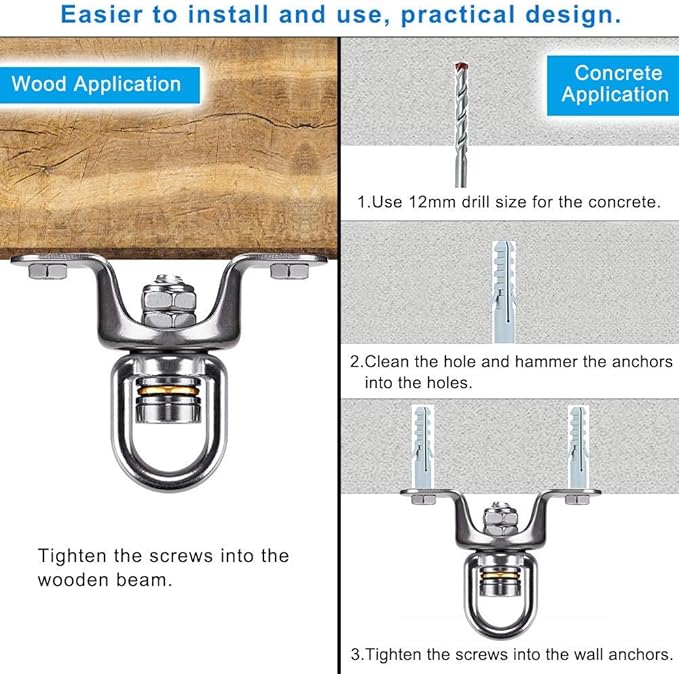 - EASY TO INSTALL: Package include 2 hexagon wood screws and 2 expansion rubber stoppers. There are two holes in the base of the swing hanger and use screws through this hole to fix it on wood beam or concrete ceiling. Come with expansion rubber stopper can mount in concrete. A unique one piece design and can be installed in minutes