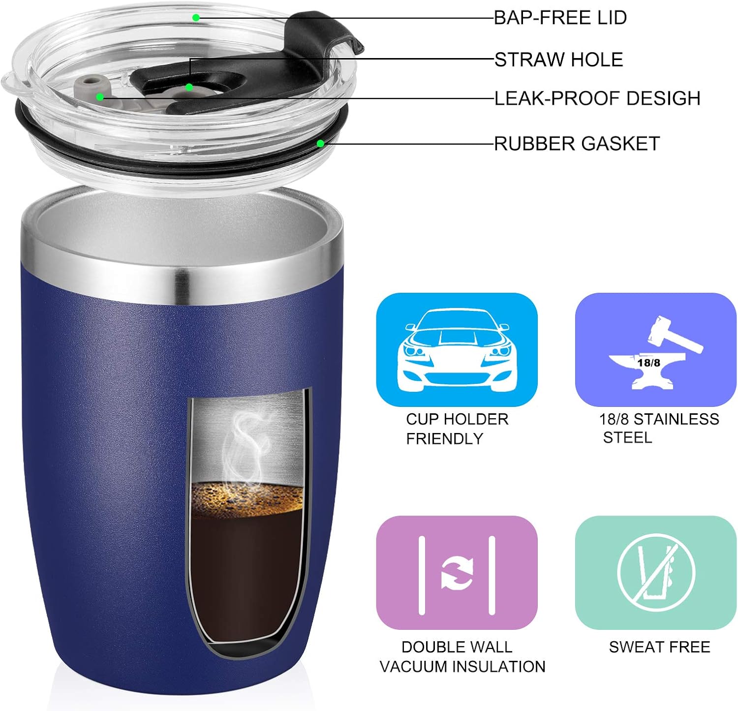 - Hot and Cold Tumbler: Double wall tumbler ensure the 12 oz coffee tumbler incredibly good at temperature protection. Under normal temperature, the insulated tumblers keep your water hot for three hours and cold for nine hours