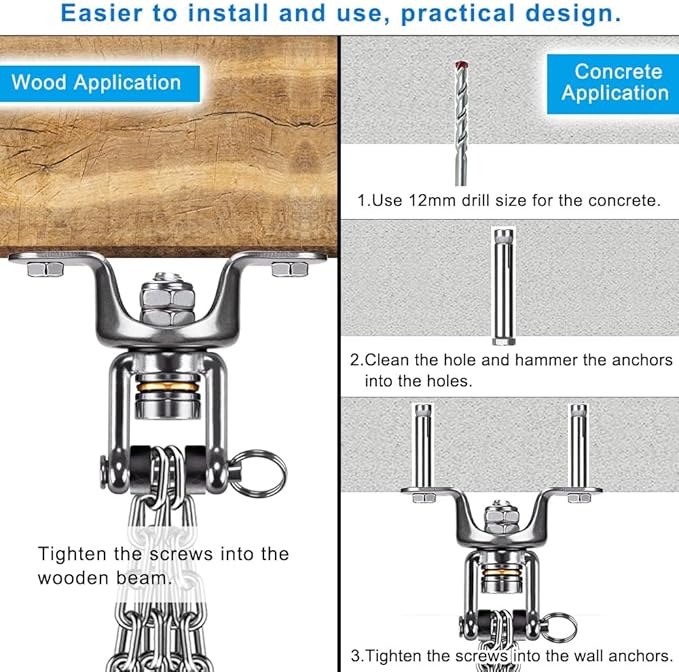 SELEWARE Heavy Duty Punching Bag Hanger with Bearing, Stainless Steel 360° Rotation Wood Beam Holder with Chains for Hanging Indoor Outdoor Boxing Punching Bag