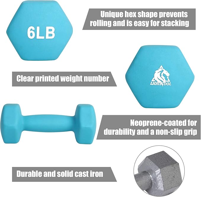 - Comfortable Grip and Anti-Roll Design: The neoprene coating on LIONSCOOL dumbbells offers a comfortable and secure grip and protects fitness equipment from getting damaged. The hexagonal shape of the dumbbell heads prevent the dumbbells from rolling away when setting them down to perform other exercises.
