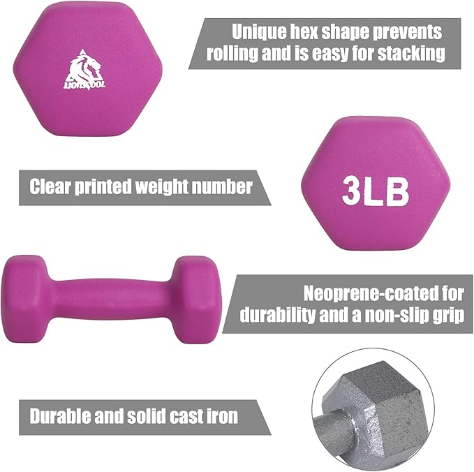 - Comfortable Grip and Anti-Roll Design: The neoprene coating on LIONSCOOL dumbbells offers a comfortable and secure grip and protects fitness equipment from getting damaged. The hexagonal shape of the dumbbell heads prevent the dumbbells from rolling away when setting them down to perform other exercises.
