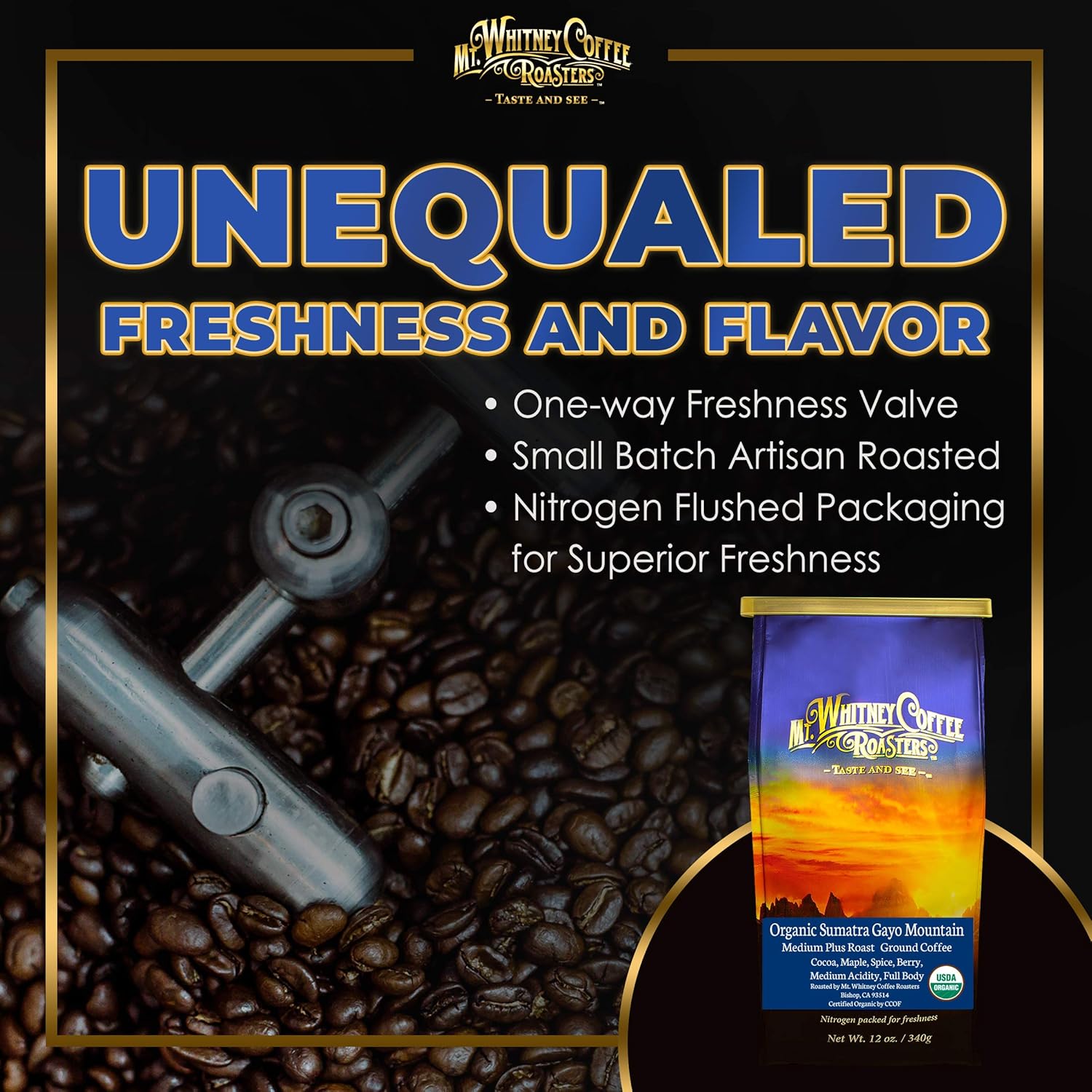 Mt. Whitney Organic Gayo Mountain Sumatra, Medium Dark Roast, Low Acid Coffee (Ground, 12 Oz)