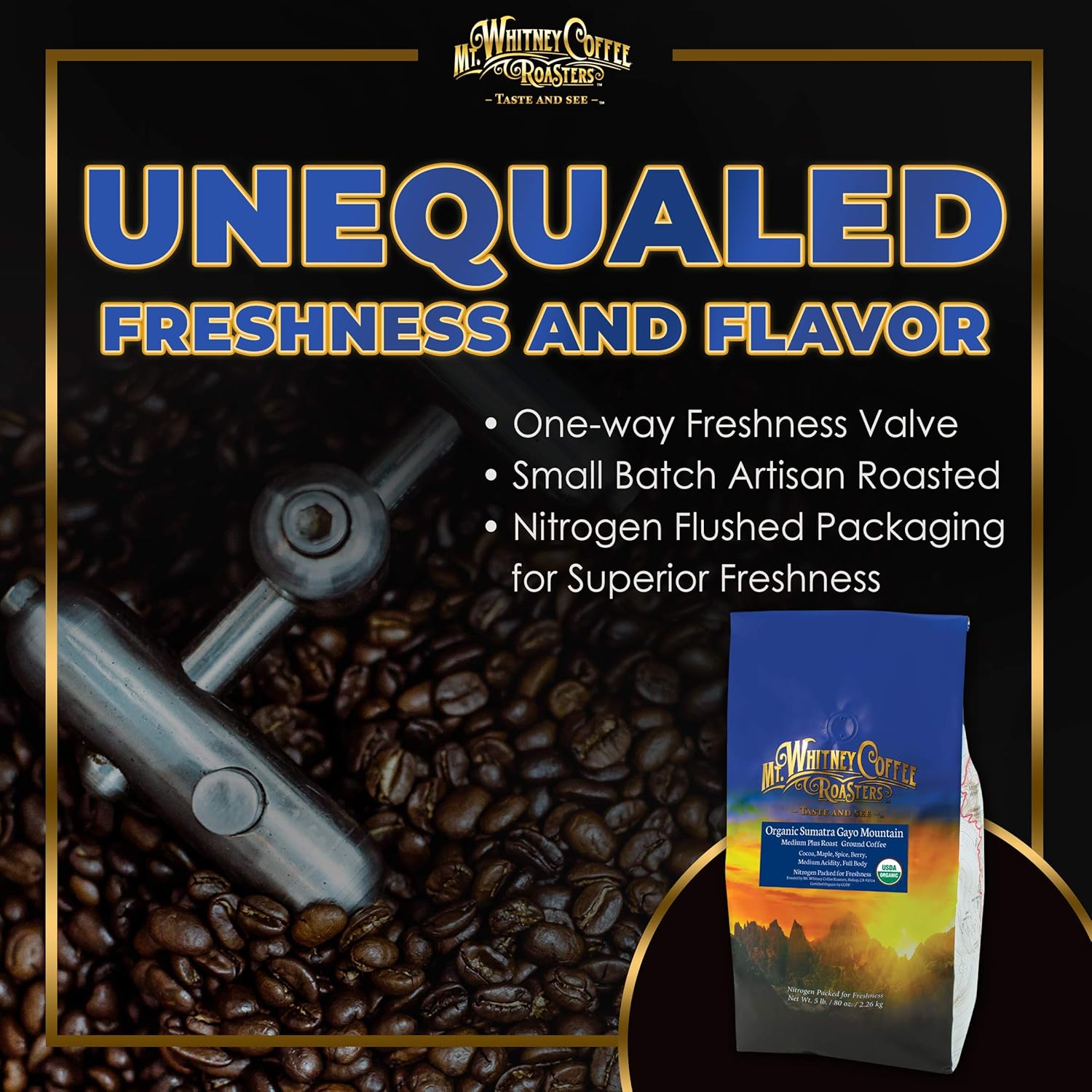 Mt. Whitney Organic Gayo Mountain Sumatra, Medium Dark Roast, Low Acid Coffee (Ground, 5 Lb)