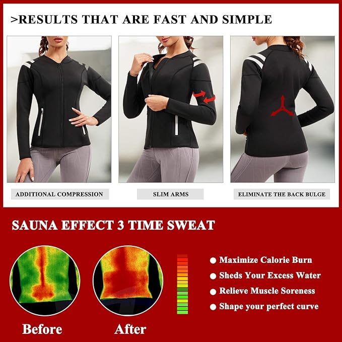 - 3 TIMES SWEAT : Our full zip up sports track workout jackets for women with thermal layer speeds up your body's calorie burning processes, can promote body heat and blood flow, increase body temperature, make you sweat like crazy and help you reducing more calories during fitness workout. The Neoprene sauna shirts for women with long sleeves allow for a wider range of motion, and with zipper is easy to put on, It also keeps body warm during cold days, more flexible that ensures free movement.