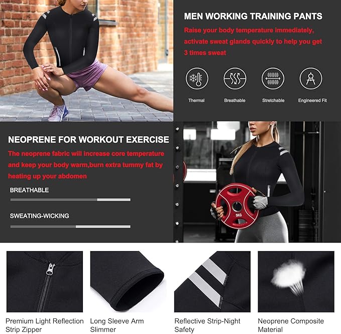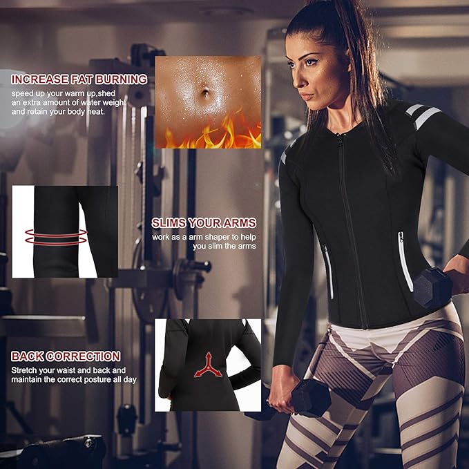- HEATING UP UPPER BODY MATERIAL : Hot neoprene workout sauna waist trainer jacket is make of neoprene material. This material assures a higher level of flexibility, breathablity and softer texture than other regular neoprene. It can absorb the sweat while keeping you dry. This long sleeve sweat suits for women makes 3 times more sweat, and can retain body heat longer that you won't feel over exhausted. It also reduces more calories during do sports to enhance the result of your workout session.