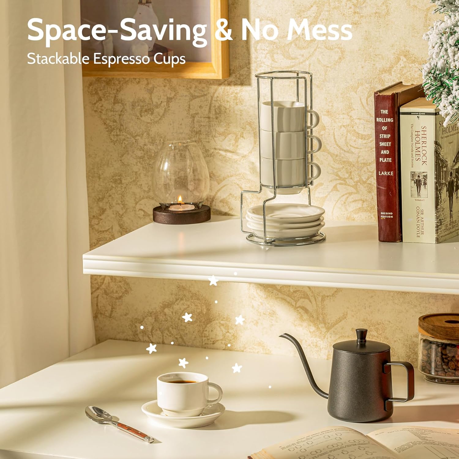 - REDEFINING CONVENIENCE IN EVERY CORNER: Transform your living space with Space-Saving & No Mess perfection. Our innovative stacking rack design keeps your cup set together, occupying just the space of one saucer. Say goodbye to clutter – even the tiniest nook becomes tidy with this compact solution, ensuring your coffee corner remains pristine and mess-free. Enjoy the simplicity of organized living.