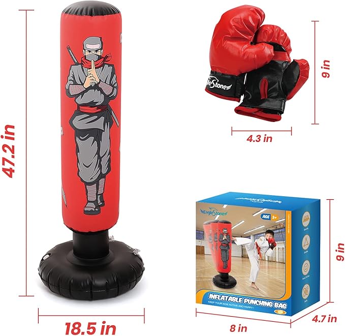 - Eco-Friendly and Durable Material: Constructed from high-quality, eco-friendly PVC, the punching bag is thick, durable, and flexible. It features an eco-friendly PET safety valve and double-layer sealing to prevent air and water leaks. The included boxing gloves are made from comfortable, durable PU leather, measuring 9 * 4.3 inches, ensuring a safe and snug fit for children's hands.