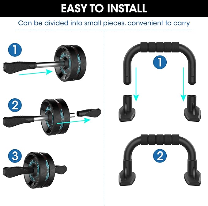 - Complete Exercise Accessories – Included in the package are 1 AB Roller, 2 Push Up Bars, 2 Resistance Bands, 1 Thick Foam Knee Mat, 1 Workout Guide, and 1 Workout Poster.