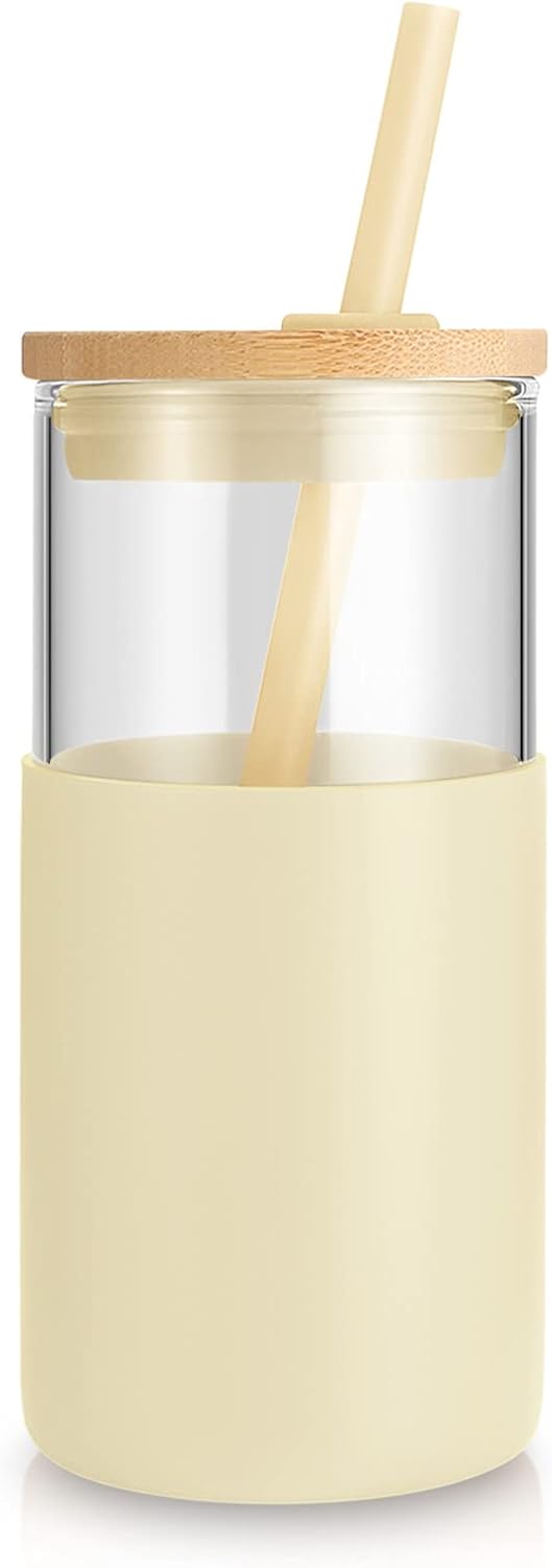 Tronco 16 oz Glass Tumbler with Straw and Bamboo Lid, Iced Coffee Cup Reusable, Smoothie Cups, Tumbler with Silicone Protective Sleeve - BPA Free