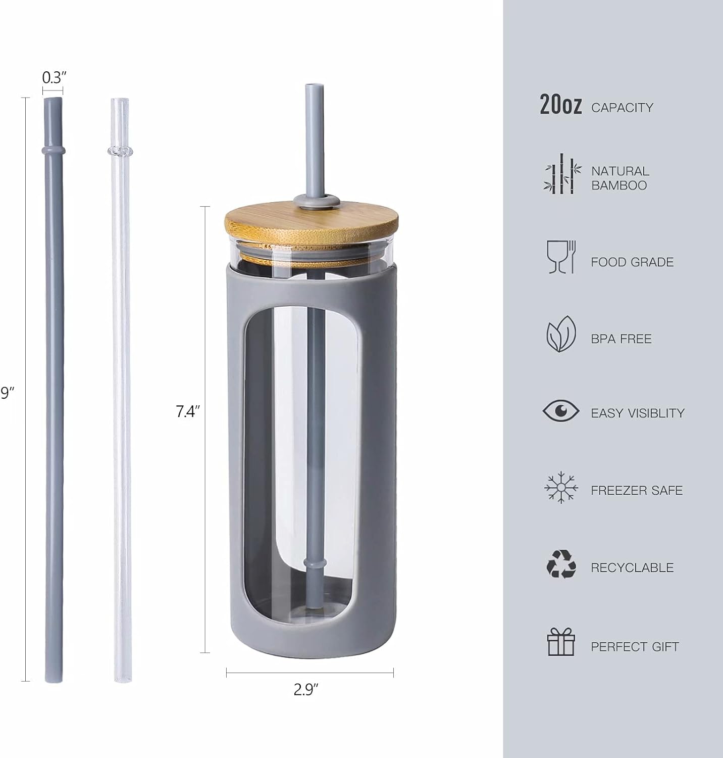 - MADE OF FOOD GRADE SILICONE: Glass cup with lid and straw features with nonslip silicone sleeve, which is a non-toxic material that does not contain any chemical fillers or byproducts, making it safe for use. The 20 oz Glass Tumbler is 2.9"- 7.4", which can fit in most car cup holders. With a wide mouth slot, you can easily put coffee powder,ice cubes,fruit,smoothies etc. which is also easier to clean