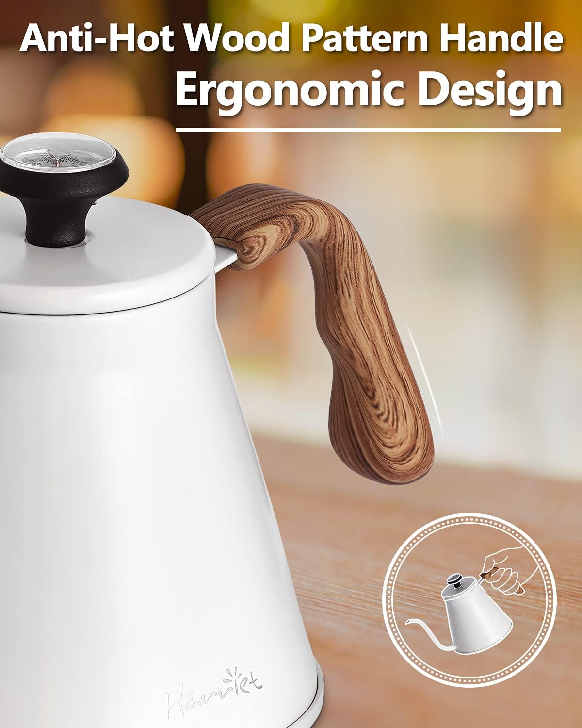 - Built in thermometer extracts optimal coffee flavor: Precision thermometer confirms 195 205°F water temperature for full aroma extraction; Slender gooseneck spout allows for a slow, steady, and controlled pour. Great for pour over, drip or manual coffee brewing