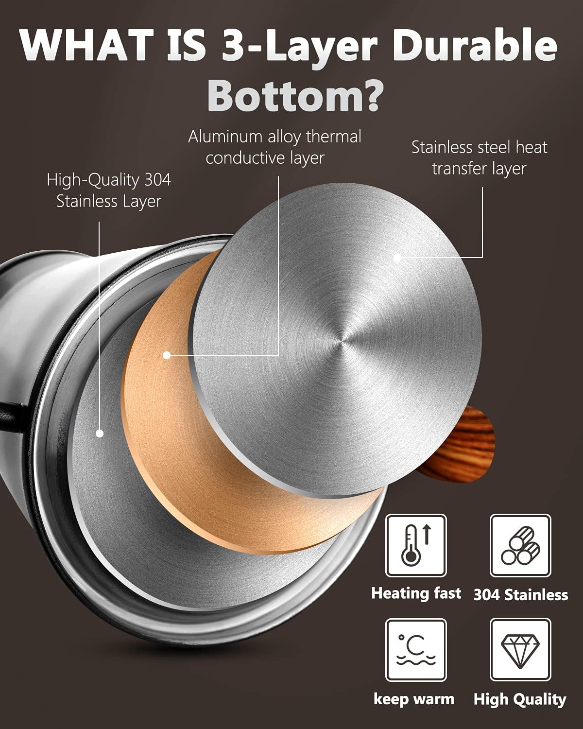 - Three layer base enhances heat retention and durability: Professional grade 18/8 stainless steel construction with triple layer base prevents rust and leaks; Uniform heat circulation ensures rapid boiling on gas, induction or electric stoves; Medium heat setting below 1400W recommended for induction compatibility