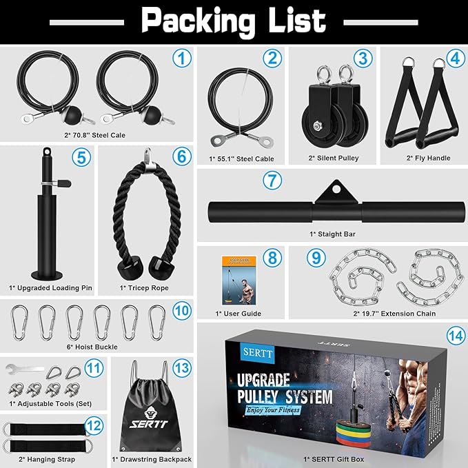 - 【Upgraded Value Kit & More Exercises Choice】 The SERTT Lat Pulley System kit has 2 pulleys and more cable machine accessories than others gym pulley system sets, allowing you to flexible DIY and choose your own way to do various exercises, such as Biceps Curl, Triceps Pull Down, Lat Pull Down, Row, Fly and etc.