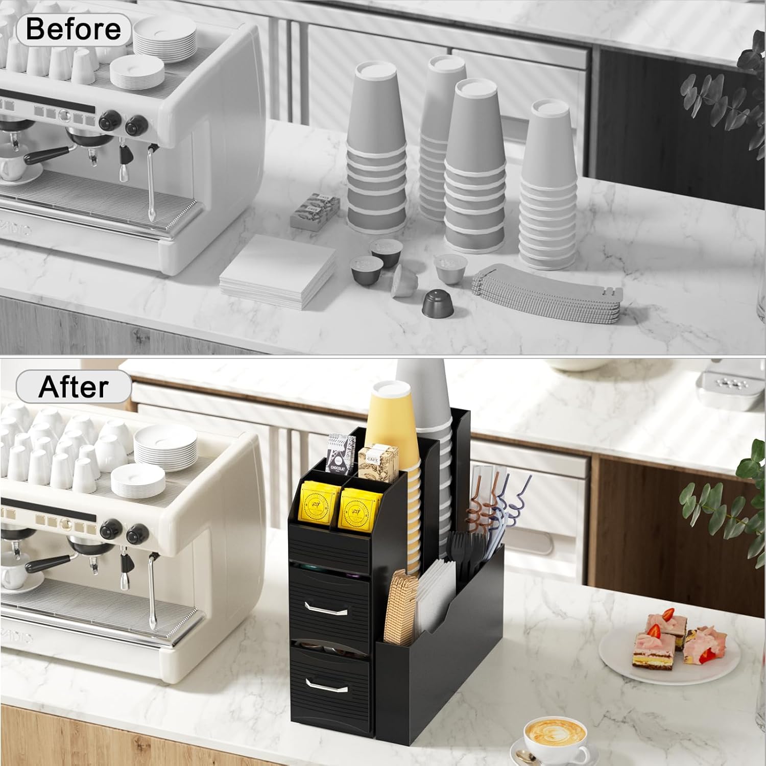 - Versatile 11 Compartments: Equipped with 6 compartments on the top, 2 on the side, and 2 coffee pod drawers, good for holding amount of paper cups, coffee pods,tea pocket,straws,spoons,stirrers,napkins,sugars or creamers.