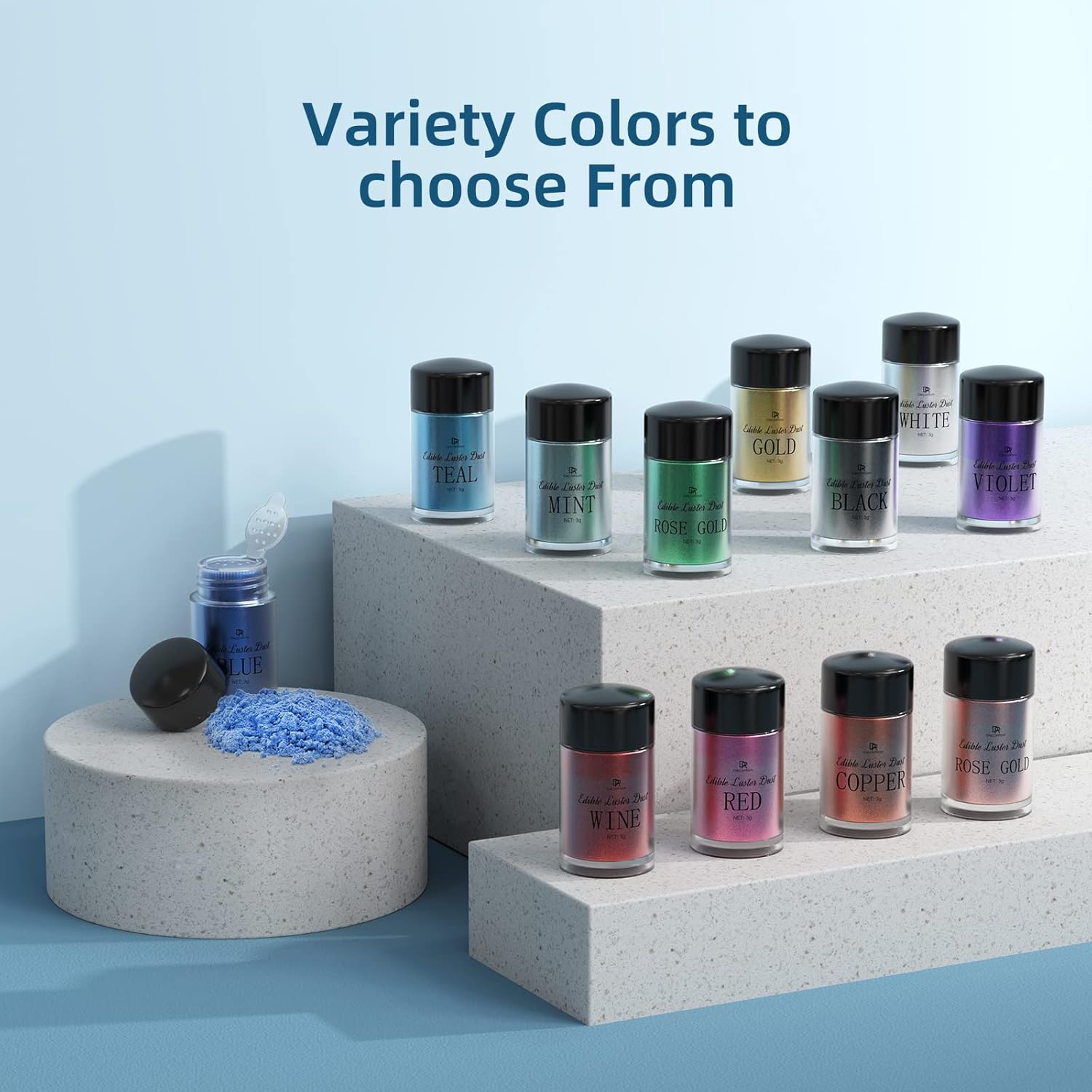 - LUXURY LUSTER DUST - Soft and fine texture dust powder can create high luster pearlized effects and adding a metallic finish to various projects and occasion. 12 colors metallic luster dust: Gold, Copper, Rose Gold, White, Green, Mint, Teal, Black, Violet, Red, Wine, Blue.
