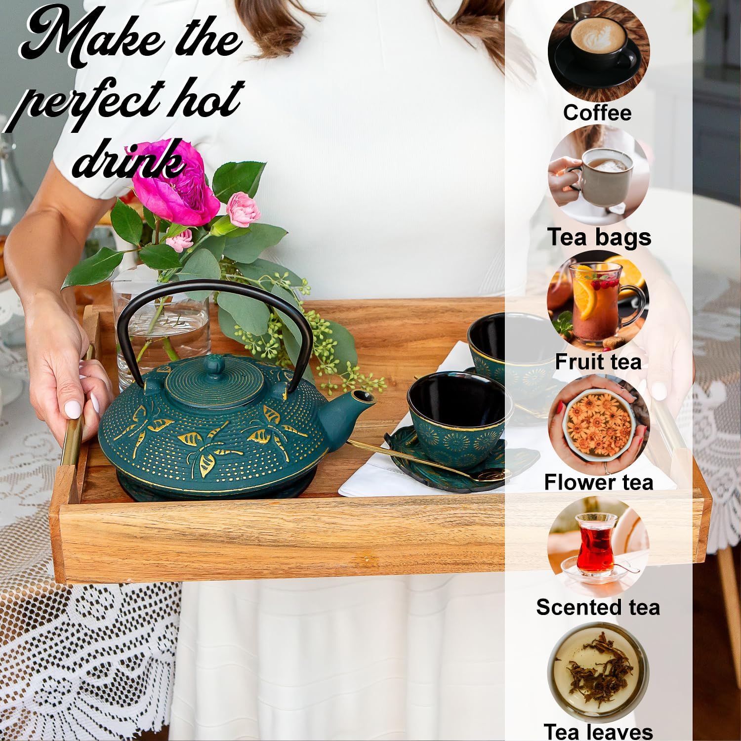 - WHAT'S IN THE SET? Contains one solid cast iron teapot weighing 3.2lbs and holds 25.36oz of your best quality Japanese Green Tea or brew of choice. 2 teacups with printed flower design and matching trivet, shaped saucers and stainless steel tea infuser. Rust-Proof enamel inside, with a hand painted and glazed exterior, which makes this “tetsubin”, a tetsu kyusu! Made for brewing tea but not for boiling.