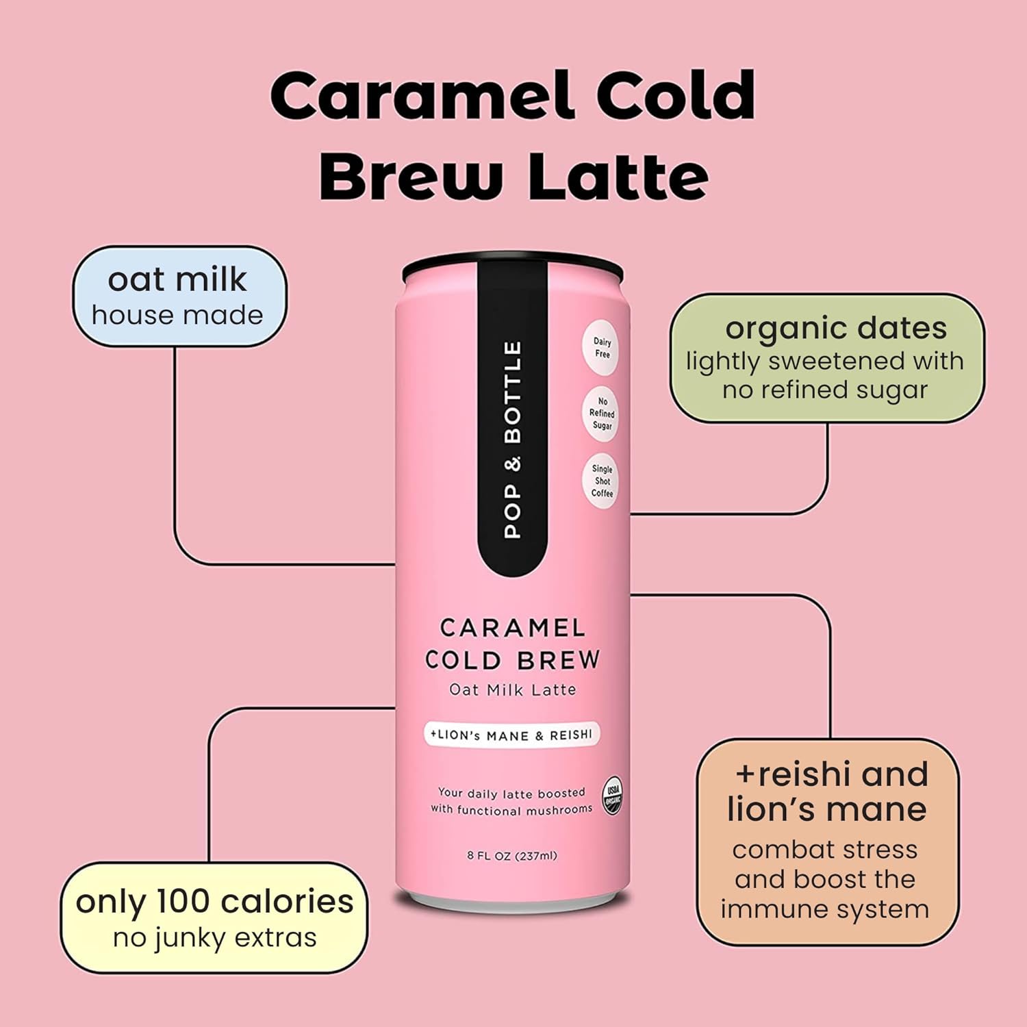 Pop & Bottle, Oat Milk Lattes - Cold Brew with Lions Mane & Reishi, MCT Oil, Single Shot Cold Brew, Mushrooms, Organic, Dairy Free, Gluten Free, Great as Iced Coffee, Lightly Sweetened with Dates - Caramel, 8 Fl Oz (12 Pack)