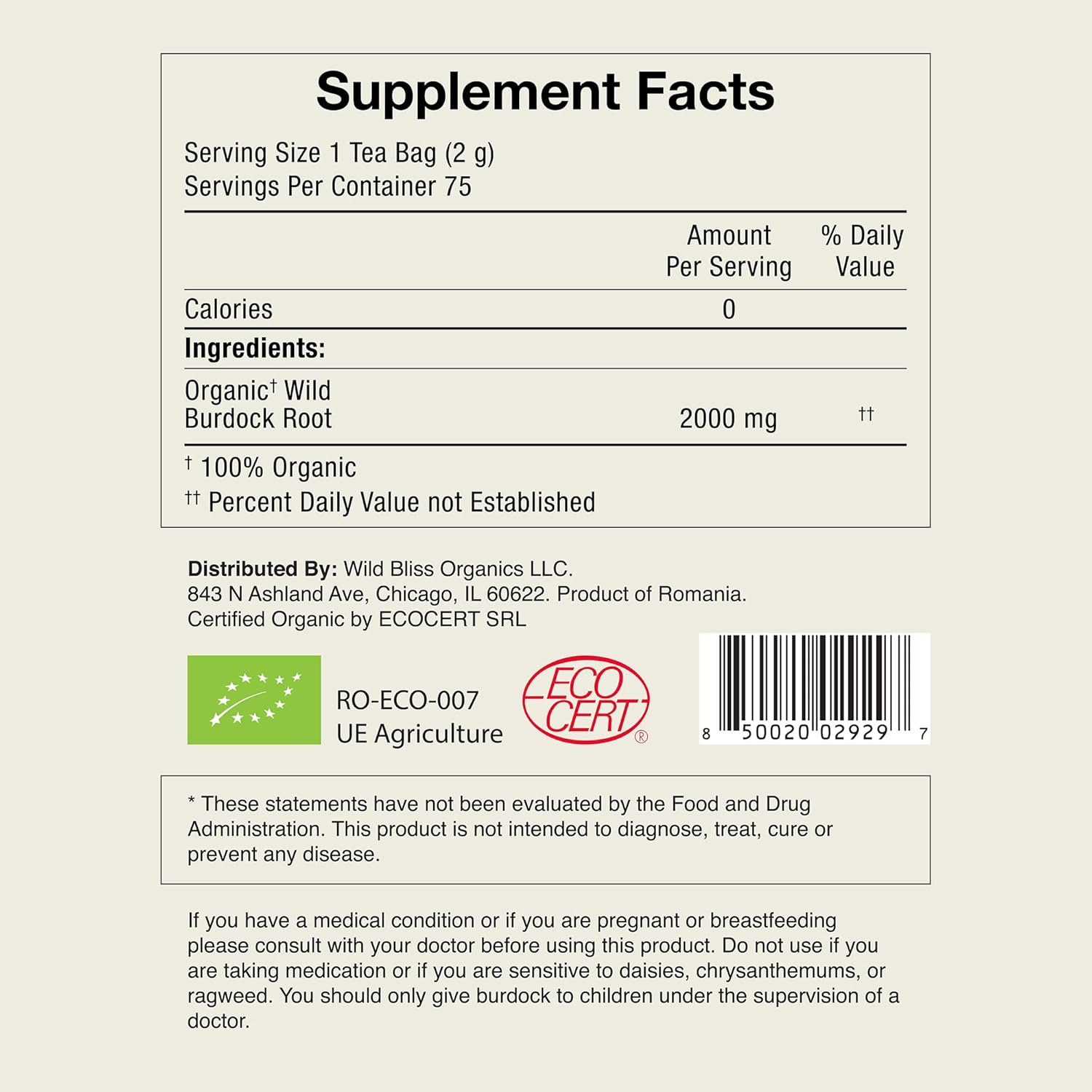 Wild Bliss Organic Burdock Root Tea - Caffeine Free Herbal Detox Support - Pharmacopoeia Quality - 75 Plant Based Tea Bags
