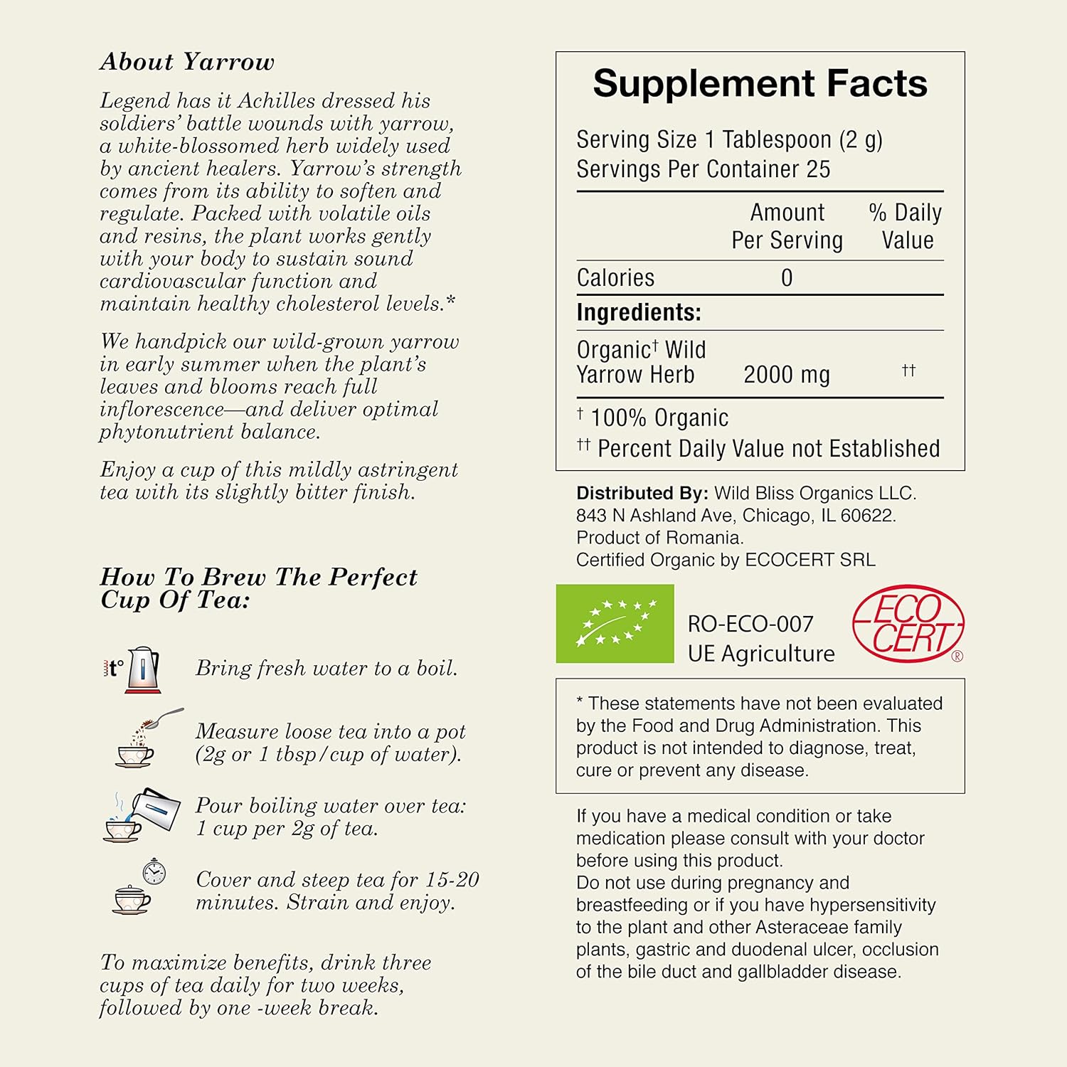 - PURE CERTIFIED ORGANIC DRIED YARROW FLOWER; Avoid harmful agricultural chemicals in your herbal tea; Wild Bliss yarrow tea is free from highly processed 'natural' flavors, additives, or preservatives