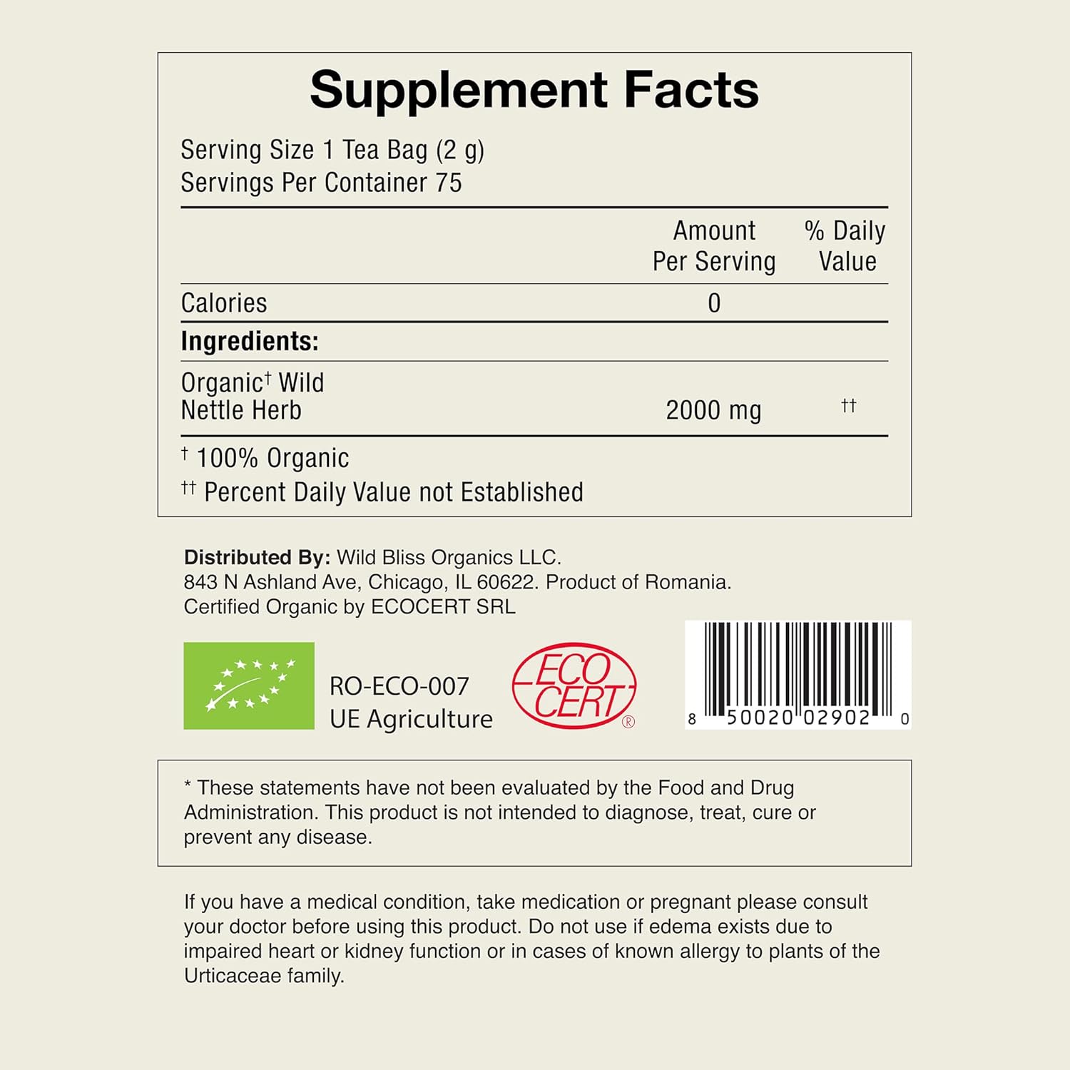 Wild Bliss Organic Wild Stinging Nettle Leaf Tea - Caffeine Free Urinary Tract and Joint Health Herbal Support - Pharmacopoeia Potency - 75 Plant Based Tea Bags