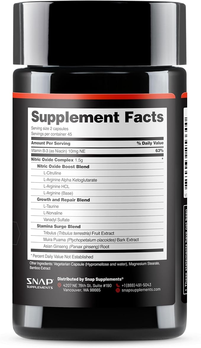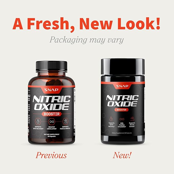 Snap Supplements Nitric Oxide Booster Supplement with L Arginine and L Citrulline Essential Amino Acids and Ginseng Root, Energy, Heart Health, Muscle Growth & Circulation Support, 90 Capsules
