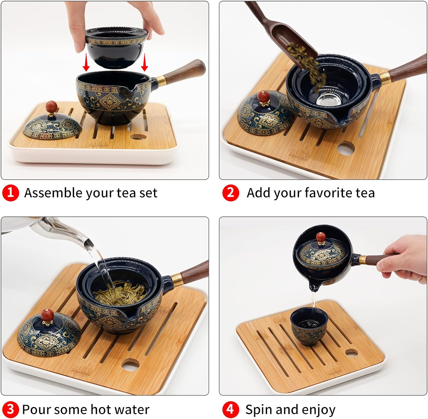 - Patented Distinctive Design: Officially licensed product. Tired of "just brewing and pouring" your lovely tea in the same way? Let's try this unique Chinese tea set and find out extra leisure from it. Unlike common teapot set in market, this rotatable teapot set defines a new look of kungfu tea, hold the handle and spin it, as a lazy tea set, you don't have to take the strainer out, enjoy a mixed spiritual sense of gongfu and tea and a special experience tea time with friends.