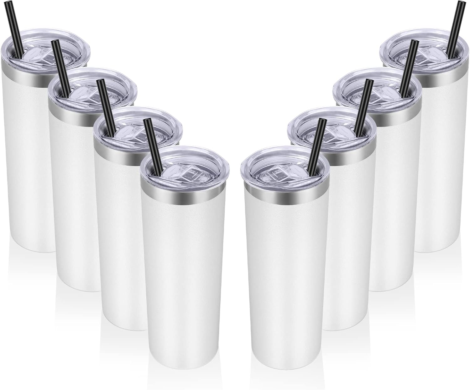 VEGOND Stainless Steel Tumblers Bulk 8 Pack, 20 oz Vacuum Insulated Skinny Tumblers with Lid and Straw, Double Wall Coffee Mug, Travel Water Cup, White