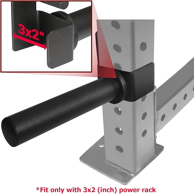- COMPATIBLE WITH ONLY 3-INCH x 2-INCH RACKS, 0.6” HOLE or LARGER HOLES AND 2” WEIGHT PLATE, BUT NOT ALL. Please note that this type does not compatible with both 2x2” and 3x3” power racks. (IT WOULD BE MUCH APPRECIATED IF YOU CHECK YOUR RACK DIMENSIONS BEFORE MAKE A PURCHASE SO AS TO PREVENT FROM UNCOMFORTABLE RETURNING PROCESS).