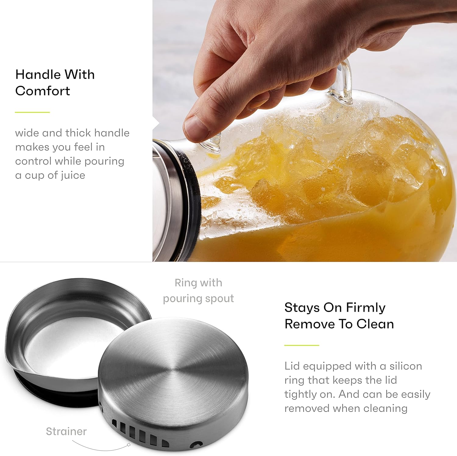 MITBAK 84- OZ Glass Pitcher With Stainless Steel Lid | Beautiful Lightweight Beverage Jug Carafe With A Wide Handle | Great For Cold & Hot Drinks Like Tea, Lemonade, Juice, Water, Coffee, Cold Brew