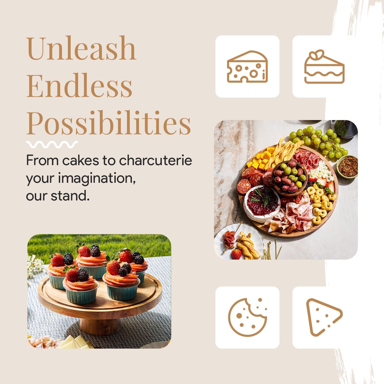 - Party Platter Perfection - Unleash your inner entertainer with a versatile serving platter. When flipped over, this wooden cake stand doubles as a charcuterie board, and can even be used for chips, dips, popcorn, or as a fruit bowl with flair