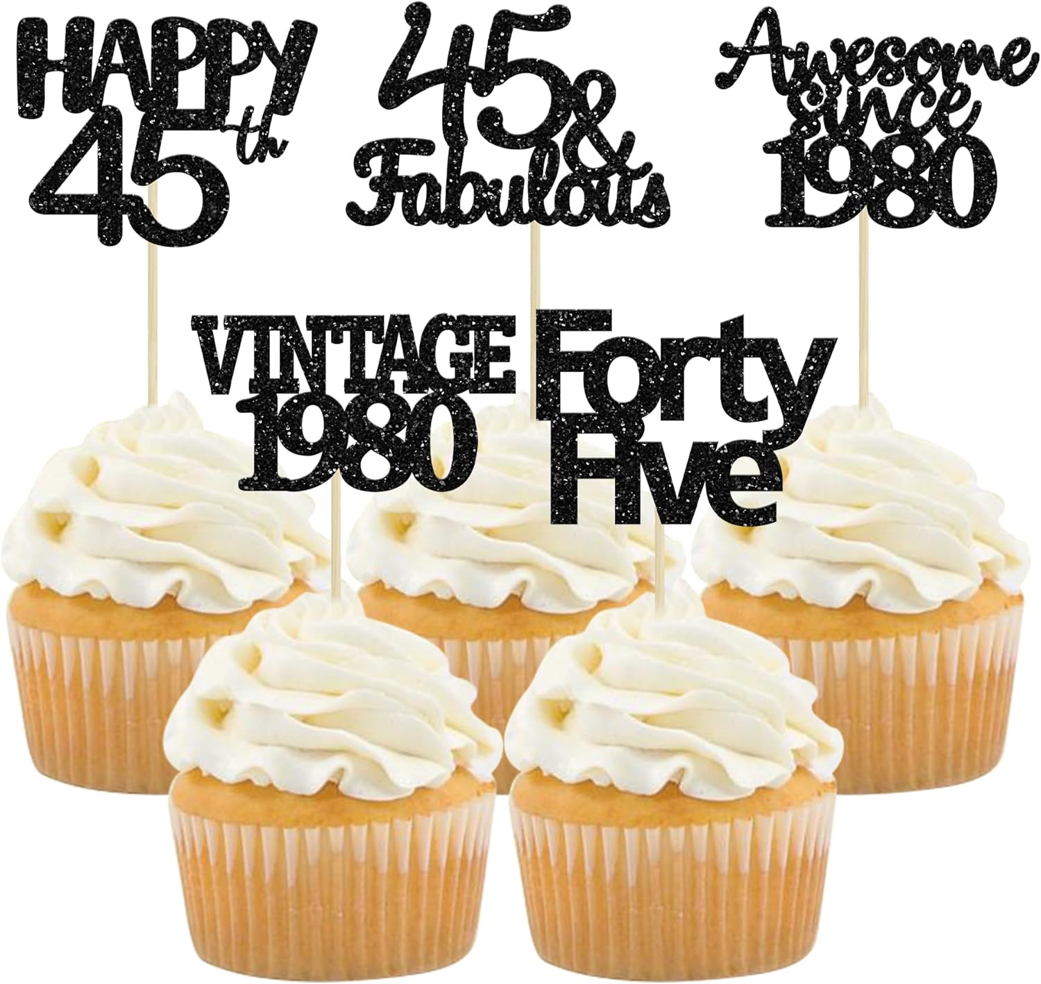 - ♡These glitter Black 45 Cupcake Toppers are so cute and good for vintage 1980 theme party, 45th birthday party, 45th wedding anniversary birthday party cake decoration. They can make your cupcake more attractive and bring the fun to your party. You can also apply them for ice cream, fruits, cookies and other desserts.