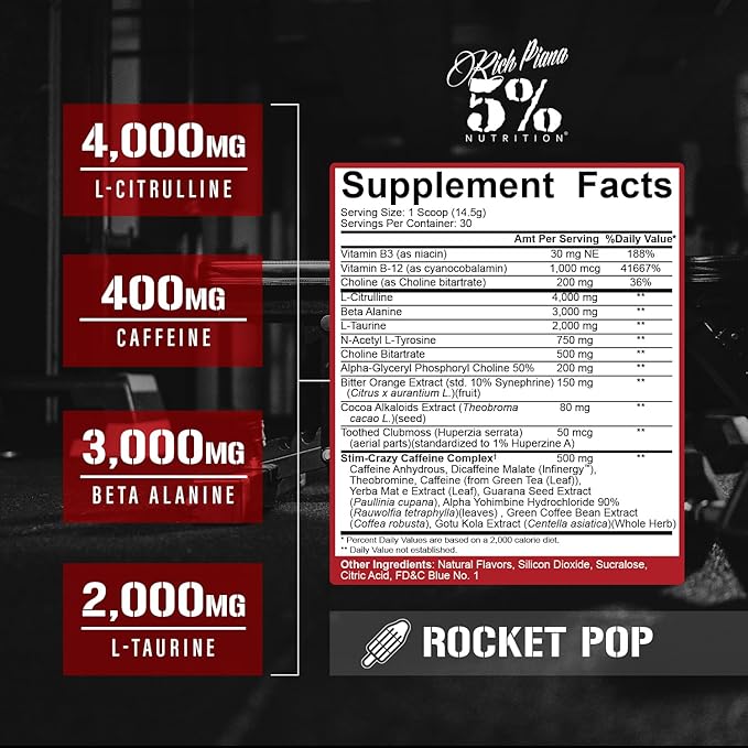 5% Nutrition Rich Piana 5150 High Stim Pre-Workout Powder | Extreme Energy, Focus, Pumps & Endurance | 400 mg Caffeine, Citrulline, Beta Alanine, N-Acetyl L-Tyrosine | 30 Srvgs (Rocket Pop)
