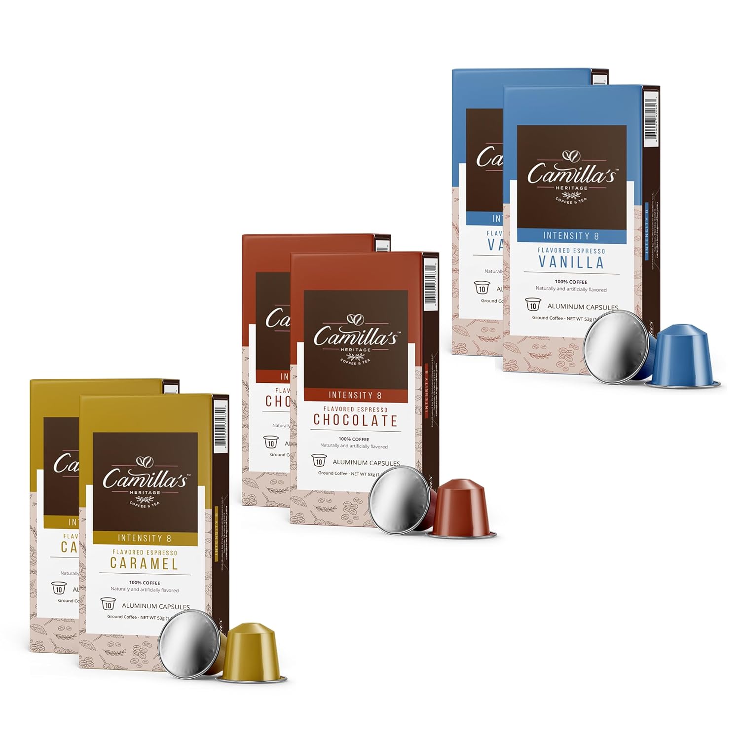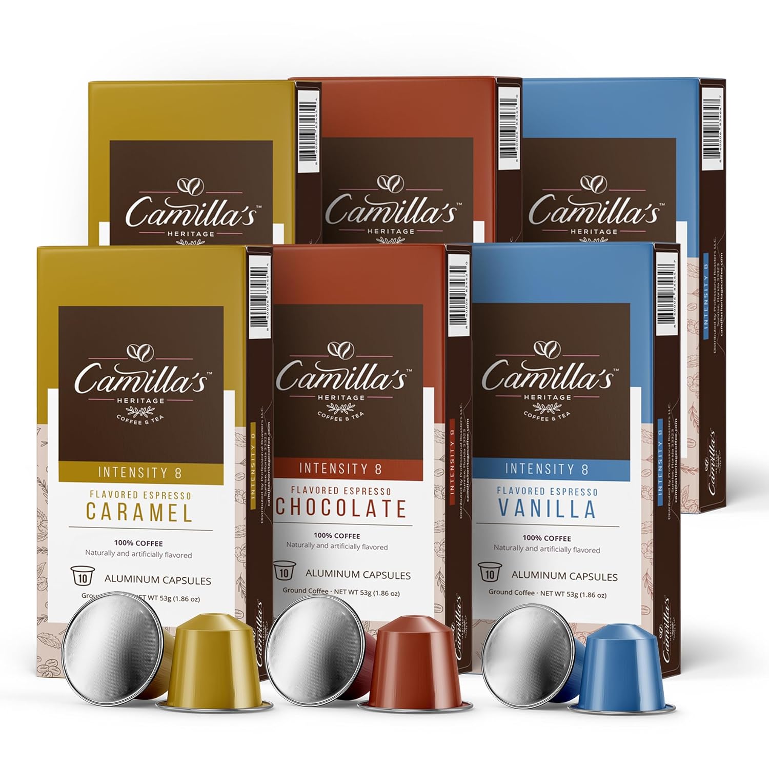 Camilla’s Heritage - Intensity 8 Flavored Espresso Coffee Variety Pack (Gourmet Chocolate, Vanilla & Caramel Espresso Cups) 60 Coffee Pods