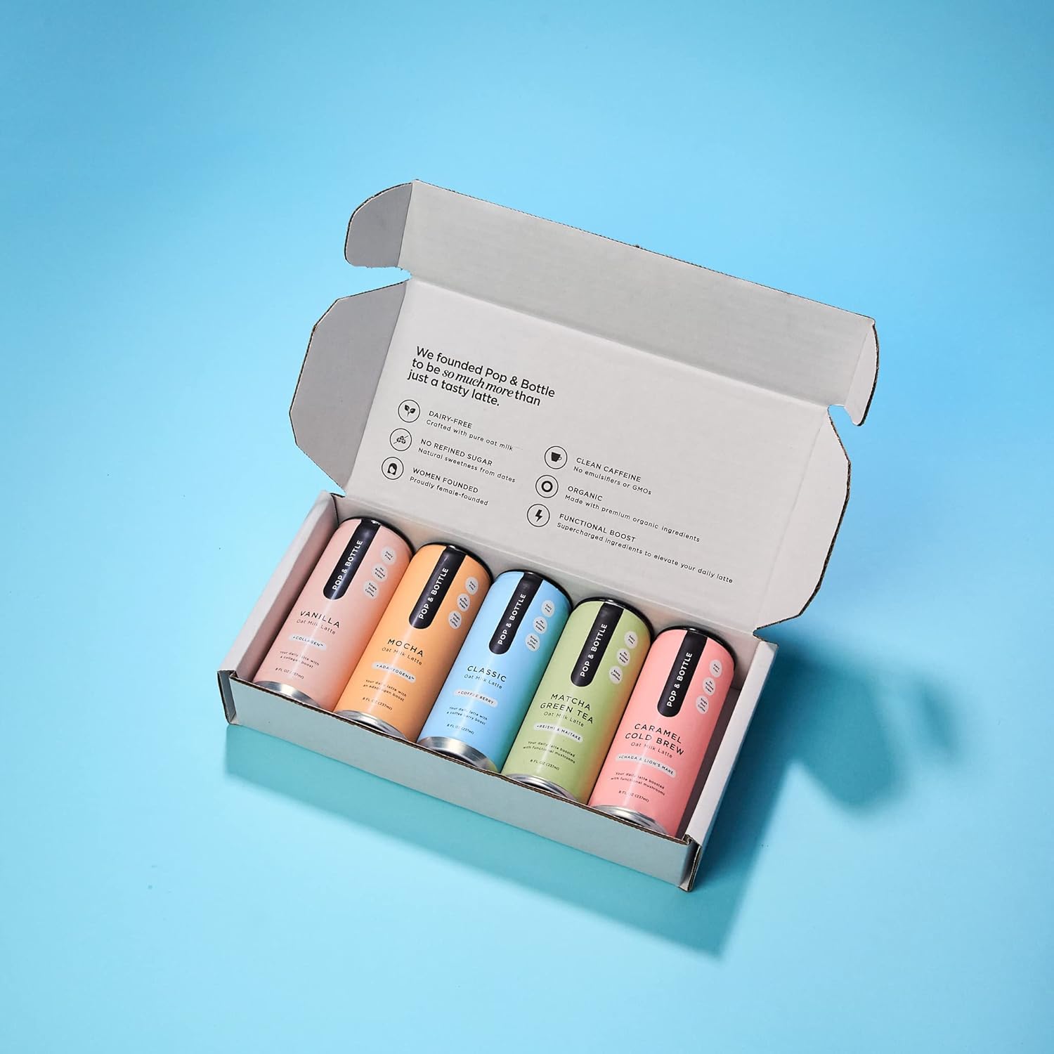 Pop & Bottle, Oat Milk Lattes - Maca, Antioxidants, Ashwagandha, MCT Oil, Collagen, Mushrooms, Organic, Dairy & Gluten Free, Great as Iced Coffee, Lightly Sweetened with Dates - 8 Fl Oz (5 Pack)
