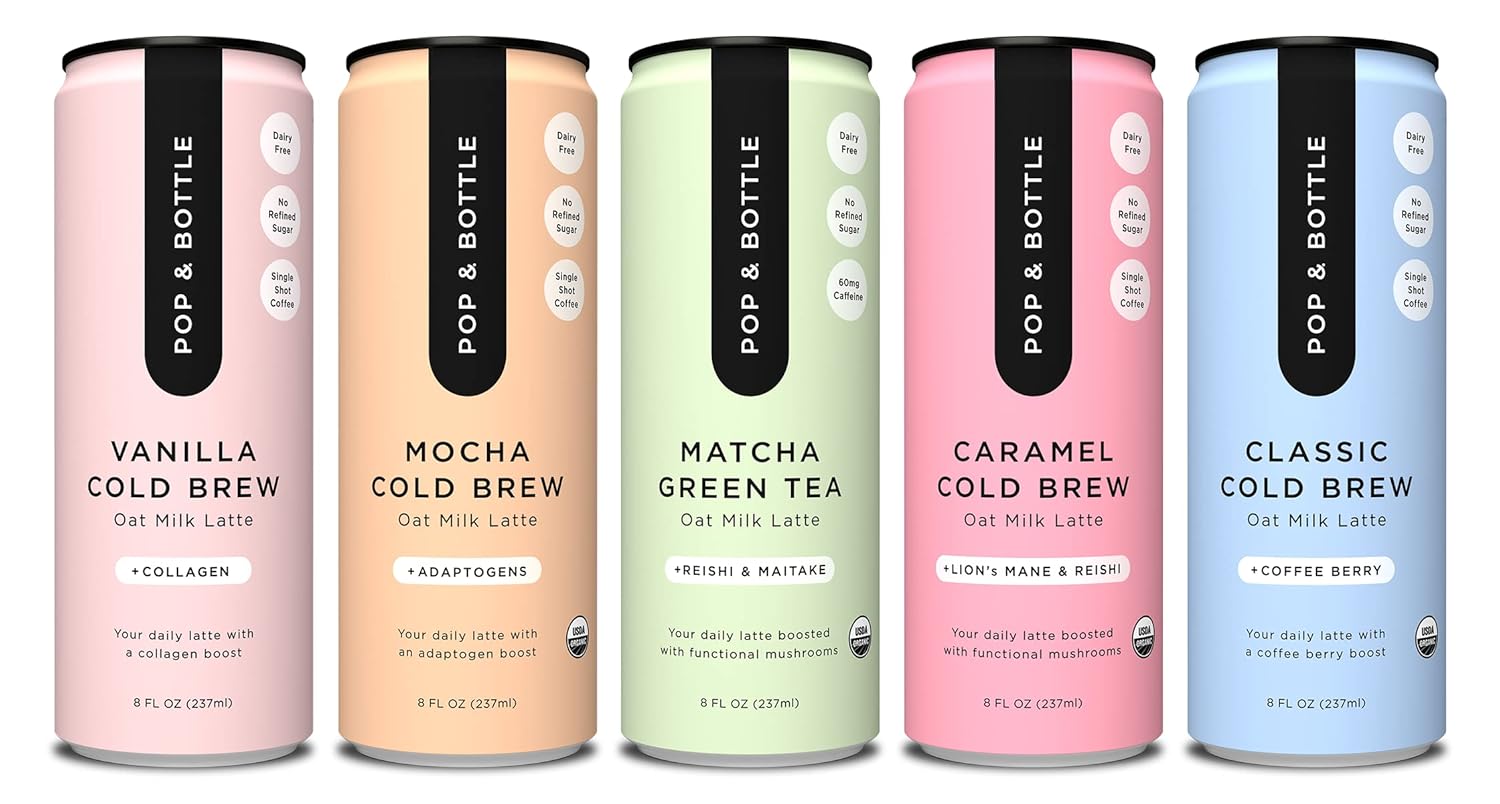 - CANNED COFFEE DRINKS - Pop and Bottle oat milk latte drinks are crafted to help jumpstart your day with organic ingredients & supplements to keep you going while at home or on the go.