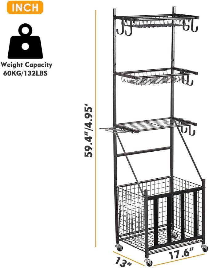 - 【SUITABLE FOR MANY OCCASIONS】- The assembled rolling storage cart features 17.6"L x 13"W x 59.4"H. Measure the place you want to place it to make sure the ball cage could well fit your garage. This sports storage rack can help you organize your kids' sports gears and make your place clean and neatly. Ideal for the garage, home, storage room, playroom, gym, basement and utility room