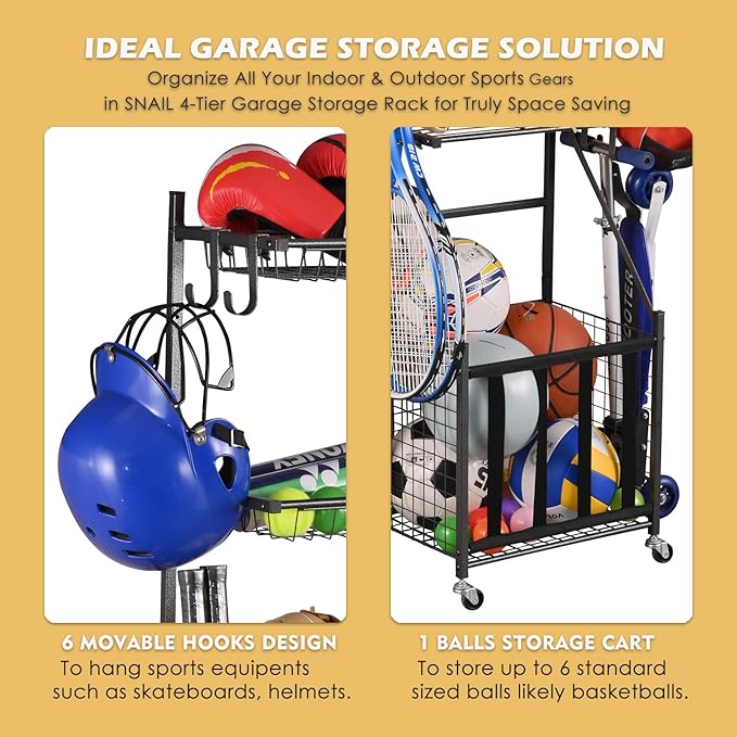 - 【IDEAL GARAGE STORAGE SOLUTION】- SNAIL 4-Tier Garage Sports Equipment Storage Organizer features 4 major storage parts: 6 Movable Heavy Duty Hooks for hanging; 2 Mesh Wire Baskets for sports balls such as baseballs, tennis balls, badminton balls etc.; 1 Shelf for sports gloves, baseball bats and badminton rackets; 1 Storage Cart with Elastic Straps to hold up to 6 standard sized balls. Organize all your indoor & outdoor sports goods in this storage rack for truly space saving