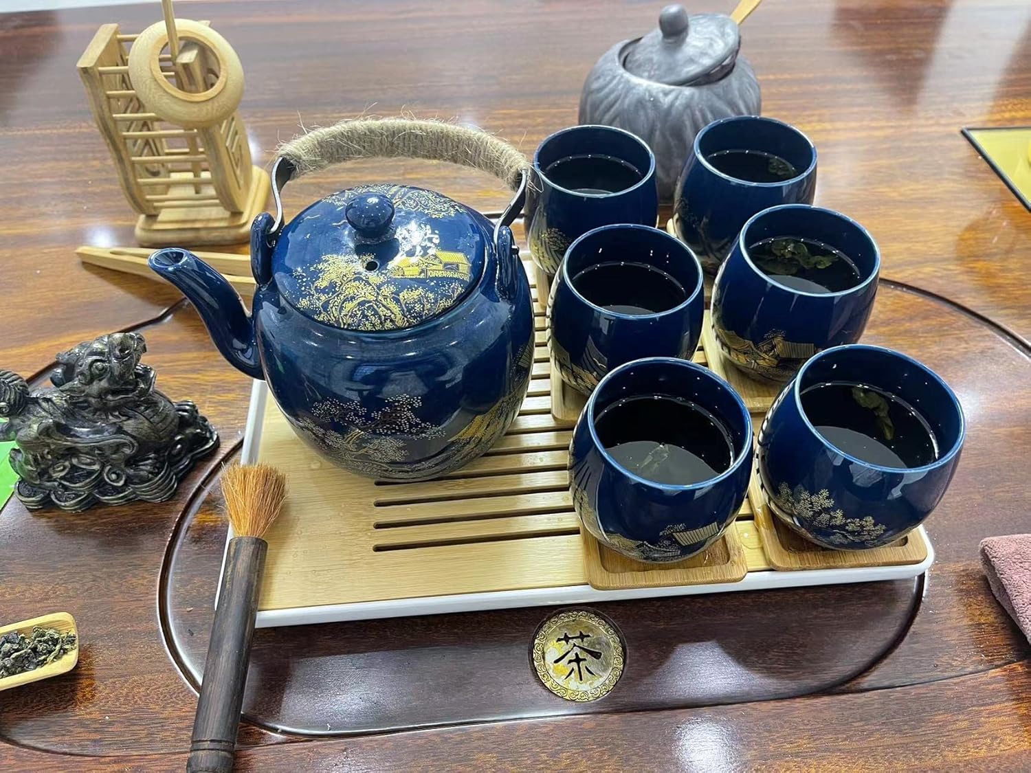Japanese Tea Set, Black Glazed Tea Set in Gift Box With 1 Teapot, 1 Tea Strainer, 1 Tea Tray and 6 Tea Cups. Ideal Tea Set for Office Home, Asian Tea Sets for Tea Lovers(Country Blue)