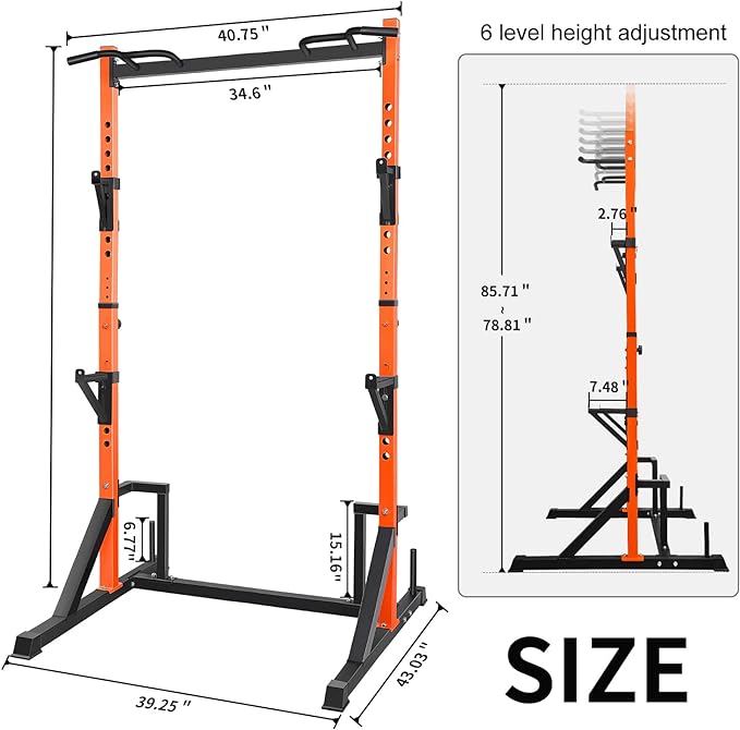 - ADJSTABLE BARBELL SUPPORT ARMS & HEIGHT:Single-side 17-hole barbell support arm with random height plus the main frame 6-speed height adjustment weight rack, whether doing squats or bench press can be well adapted to different heights and different parts of the exercise needs. Standard 1in adjustment hole to accommodate most market accessories