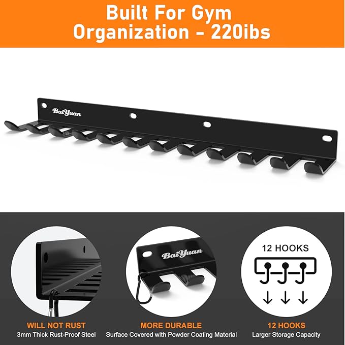 Home Gym Storage Rack - Multi-Purpose Heavy Duty Gym Rack Organizer, Wall Mount Barbell Rack Gym Equipment Hanger for Olympic Barbells, Resistance Bands, Jump Ropes, Row Handles, etc. (26", 12 Hook)