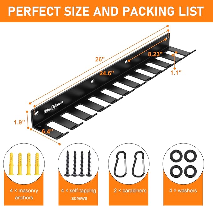 - Dimensional Parameters: The overall size of the gym wall storage rack is 26in (L) x 6in (W) x 1.9in (H). Hook to hook spacing is 1.1 in