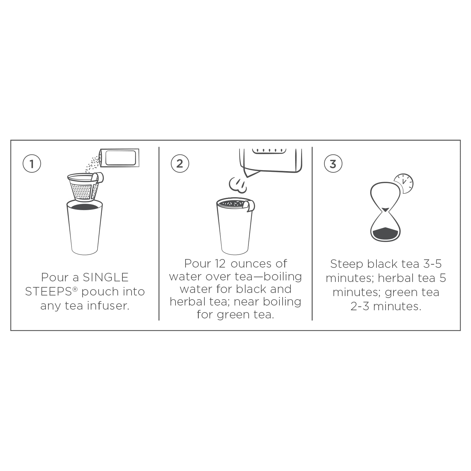- STEEP THE PERFECT CUP of hot tea: Place tea leaves in tea infuser or strainer and pour water over the leaves. Steep for 5-7 minutes. Enjoy!