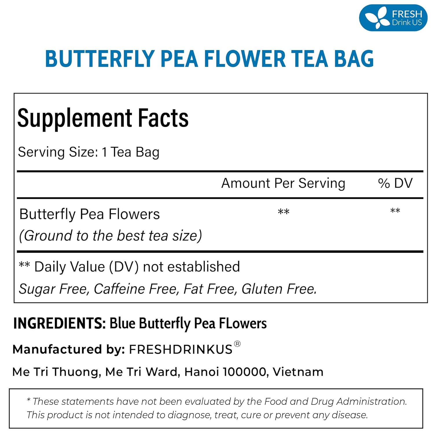FreshDrinkUS, Premium 35 Butterfly Pea Tea Bags, 100% Natural and Pure from Butterfly Pea Flowers, Hand-made, Made With Natural Materials-Corn Fiber Tea Bag, Sugar/Caffeine/Gluten Free, Vegan